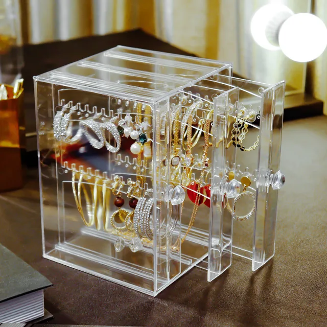 Clear plastic jewellery dustproof storage box, acryllic three piece necklace and earrings display rack